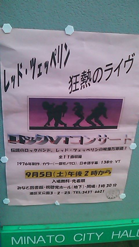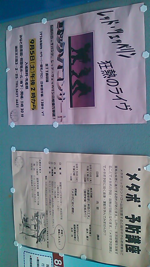 街の掲示板には、たまにおもしろい催し物の案内が掲載されている。これは、なかなかすごかった。レッドツェッペリン狂熱のライヴ と メタボ・・・(笑)by紫ライブin東京2009紫社長!